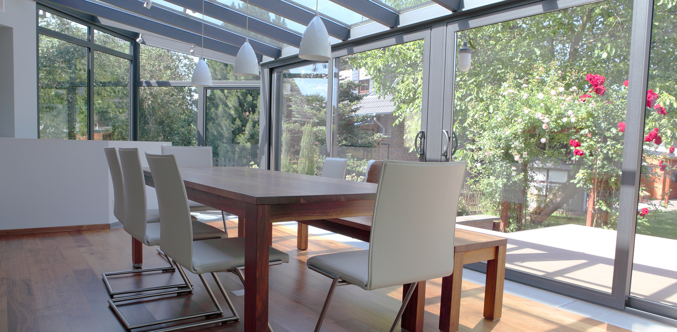 Mit einem Wintergarten erweitern Sie Ihren Lebensraum um ein "zweites Wohnzimmer" oder verwirklichen Sie sich ganz unabhängig vom Wetter den Traum vom "Essbereich unter freiem Himmel". Zweifelsohne steigert er mit seinen vielfältigen Möglichkeiten der Wohnraumerweiterung die Wohnqualität und gibt Ihrem Wohngefühl damit eine neue Dimension. Im Inneren vermittelt die massive Konstruktion aus Leimholz ein naturnahes Wohngefühl und gleichzeitig sorgt die hochwertige Aluminiumkonstruktion im Außenbereich für ein Maximum an Witterungsbeständigkeit, verbunden mit einem Minimum an Pflegeaufwand.